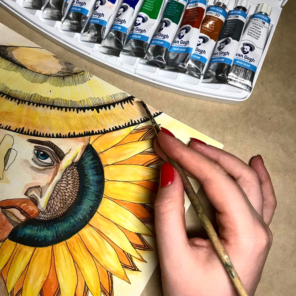 Ван Гог использовал в основном тяжёлый желтый,если, конечно, его можно таким назвать. В своем солнечном настроении я пыталась изобразить Винсента опираясь на светлые и теплые тона. Но нельзя не отметить тяжёлый взгляд, смотрящий на нас.