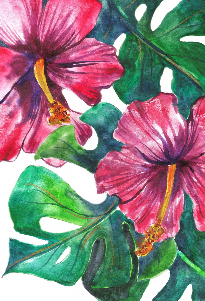 Гибискус. Цветок рассвета. Акварельная работа создана на основе воспоминаний о южных странах. Синее небо, белый песок и цветы! Яркие и большие соцветия! Картина украсит не только маленький пузырёк, но и прекрасно будет смотреться на стене Вашего дома, принеся с собой часть лета!
