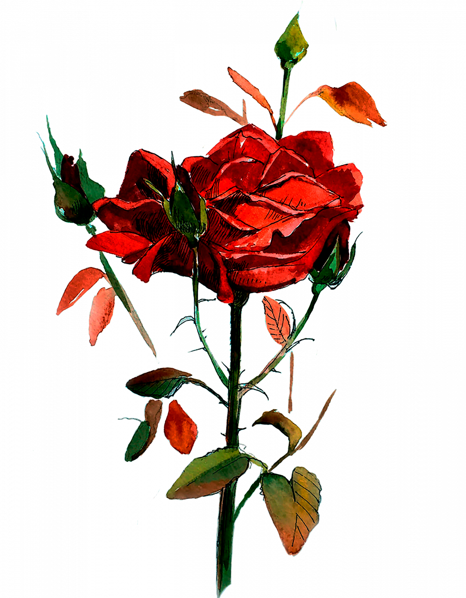 Роза на стебле с бутонами. Красная роза выполнена акварелью. Чудесная и трогательная королева цветов может украсить всё!