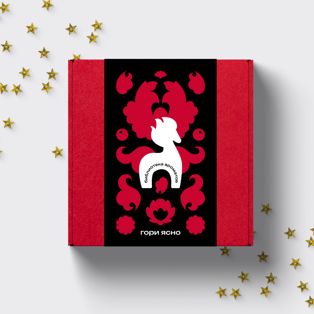 Праздничная коробка с красочными элементами хохломы и пермогорской росписи. В эту коробочку идеально поместится два одеколона, четыре парфюмерной воды 15 мл или 18 мл, несколько флаконов масляных духов 10 мл.