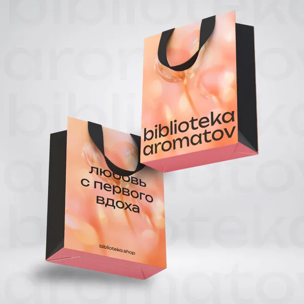 Стильный персиковый брендированный пакет из плотной бумаги идеально подойдет для любого подарка. Его удобно нести за ручки из репсовой ленты.