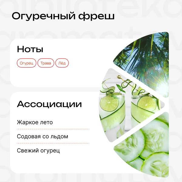 Огуречный фреш дарит незамедлительное спасение в жару. Так и наш аромат снимает напряжение и охлаждает свежими зелёными нотами. Теперь аромат-выручалочка будет всегда с вами и поможет расслабиться в самый раскалённый день.