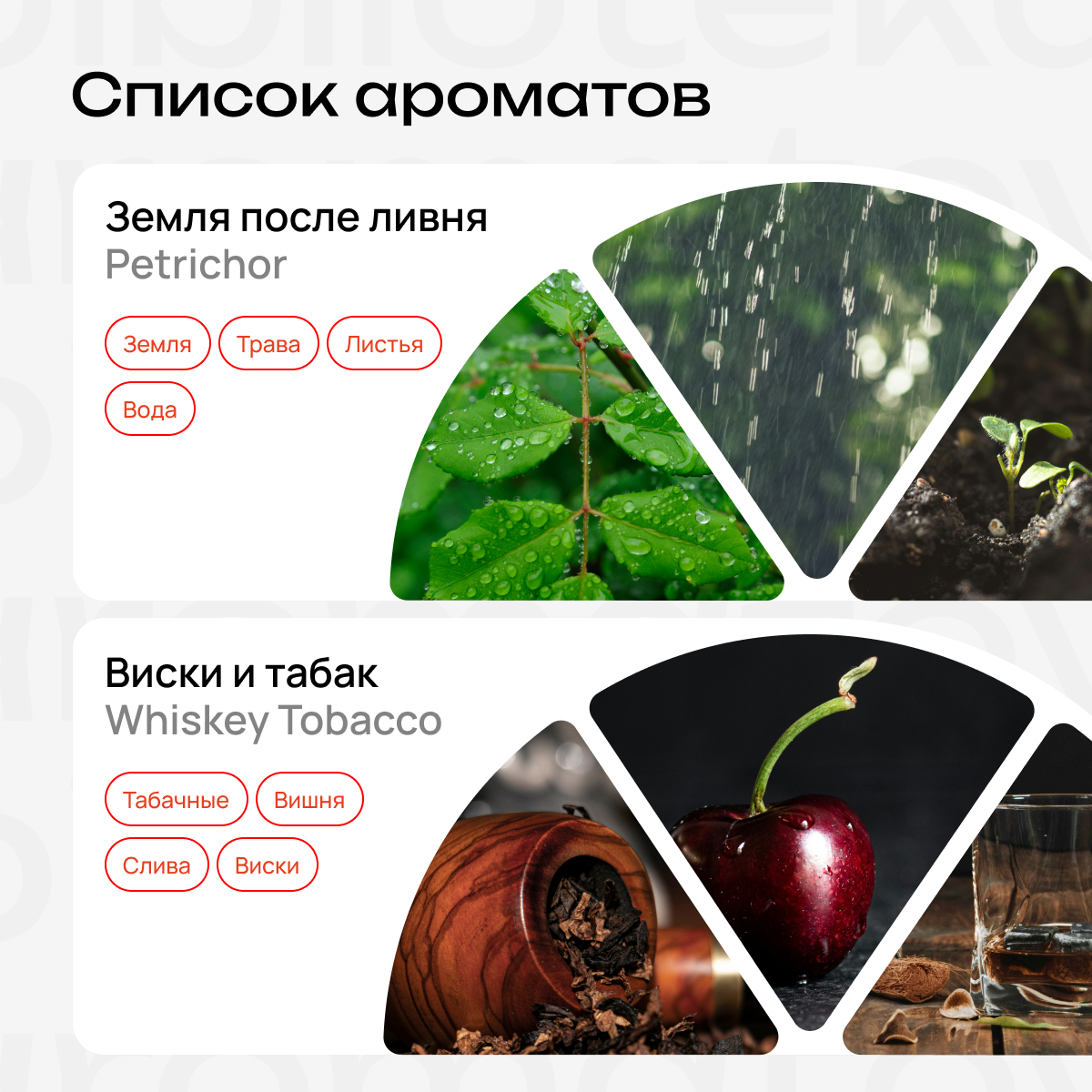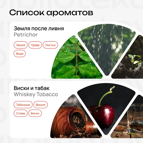 Whiskey Tobacco (Виски и табак) — выдержанный виски, табачный лист и терпкая слива. Кожаное кресло и закат, который хочется пить мелкими глотками.
