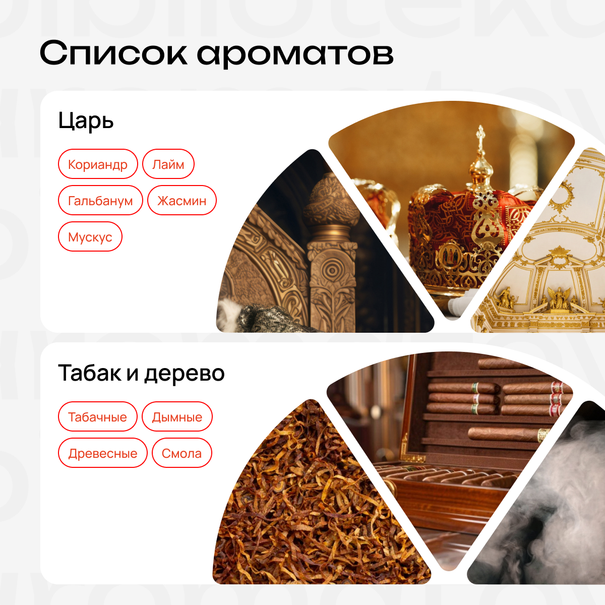 Tsar (Царь) — ноты авторитета: холодный лайм и кориандр, зелень гальбанума и тёплый шлейф мускуса.