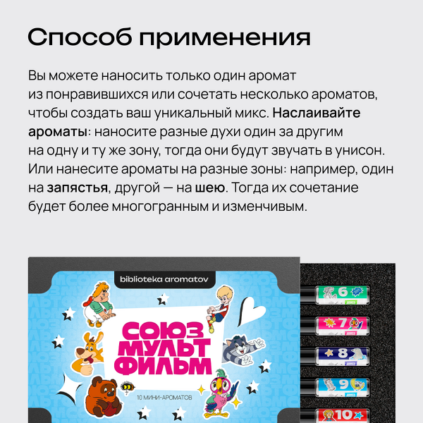 В каждом мини-флаконе — аромат, который погружает в сказочный мир любимой истории из детства. Как думаете, могли бы подружиться Ёжик и Винни Пух? Попробуйте смешать моноароматы из флаконов и придумайте свою историю!