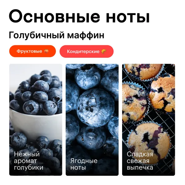 Аромат «Голубичный маффин» — то, что хочется слышать при входе в любую кофейню. Как в нежном тесте комфортно чувствуют себя яркие вкрапления голубики, так и сладкий аромат выпечки дополняют ноты с кислинкой.