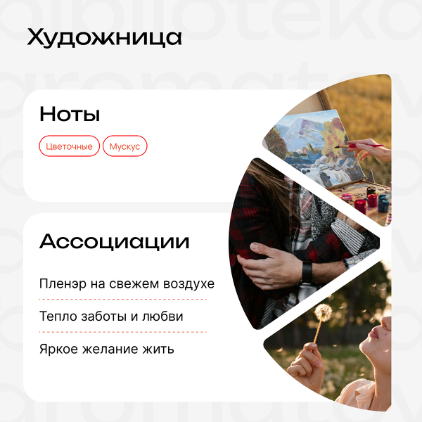 Ветер крепчает. Но что бы нам ни готовила судьба, нужно жить, творить, любить. Поэтому в аромате ускользающей куда-то за пределы мечты, но жизнерадостной художницы распускаются полевые цветы, на которые упали капли свежей краски. Это ода тихой стойкости и хрупкой красоте, вопреки скоротечности жизни. Когда цветочные ноты успокоятся, вас обнимет мускусное тепло. Как напоминание о том, что даже в прощании может жить любовь и свет.