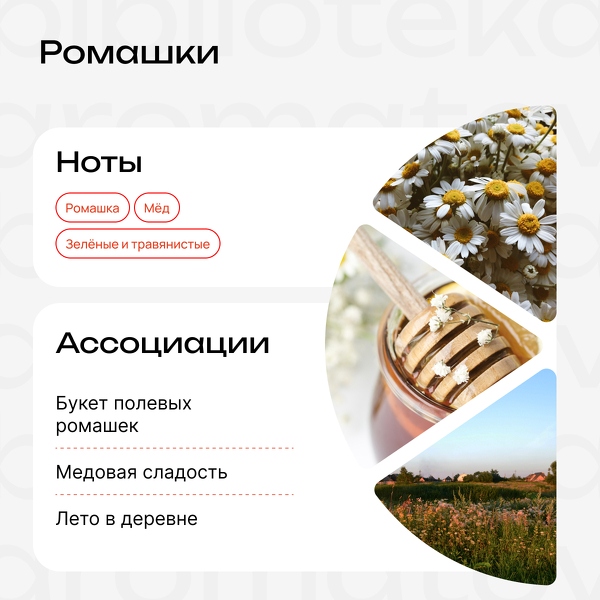 Знойный полдень и беззаботное счастье. Представьте бескрайнее поле, где ветер колышет белые ромашки в зелёной траве. Солнце прогревает воздух, и к свежести стеблей примешивается тягучая медовая сладость. Этот аромат погружает в то самое чувство свободы, которое бывает только долгим летним днём.