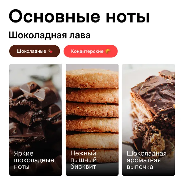 Как десерт играет текстурами — от пышного бисквита до тягучей начинки, — так и аромат взывает к вашим чувствам. Одного вдоха плотной шоколадной ноты хватит, чтобы забыть о проблемах. Всё будет лава-лава.