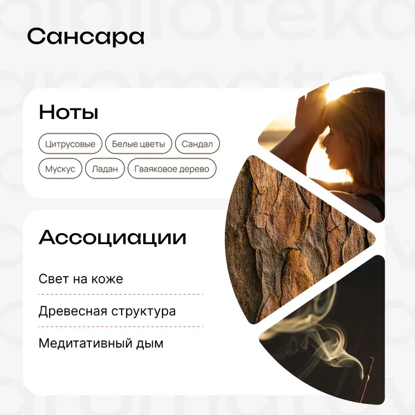 Цитрусы в верхних нотах свежие, чуть прохладные, как свет на коже. Переплетаются с травянистой горчинкой белых цветов. Мягкими, едва уловимыми, словно дыхание, которое становится ровнее. Сандал и кедр создают устойчивость, структуру — тёплую, древесную, чуть сухую. Это аромат, который помогает не держаться за старое, а стоять в новом спокойно и уверенно. Белый мускус в нотах сердца не заявляет о себе, а добавляет чистоты и поддерживает. Эфирные масла гваякового дерева и ладана дают глубину — обволакивающую, почти медитативную. Это не громкий дым, а ощущение пространства внутри себя.
