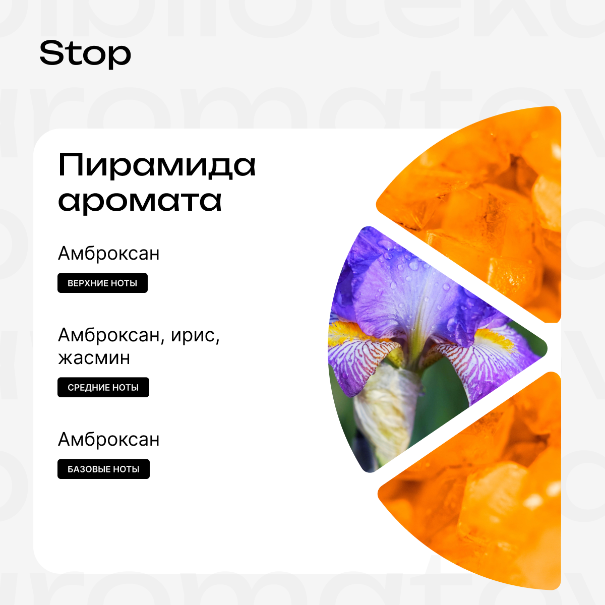 Абсолютная власть, которая говорит громче слов. «Stop»— это гипнотический импульс амброксана, не терпящий возражений. Его сияние, подкреплённое прохладой ириса и томностью жасмина, диктует правила игры, где контроль становится высшим наслаждением. Это стоп-слово, которое хочется повторять.