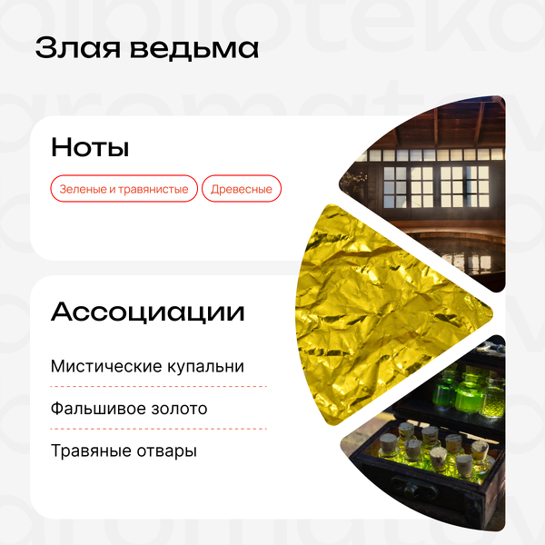 Замечательный травяной аромат, действительно очень «ведьмин». Чувствуются и древесные ноты, будто зашёл в избушку Бабы Яги: на стенах развешаны пучки сушёных трав, а в котле варится зелье