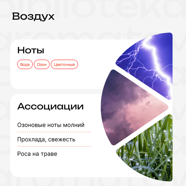 это не просто воздух, а наэлектризованный влажный воздух перед грозой! мне понравился, хотя представлялось что-то совсем иное. свежий, влажный аромат с какой-то сладковатой нотой на фоне, будто стоишь в цветочном поле, дует сильный ветер и вот-вот польёт ливень