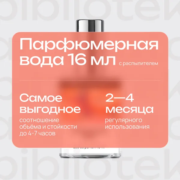 Парфюмерная композиция 18%Уникальное сочетание высококачественных натуральных или синтетических парфюмерных компонентов. Концентрация в парфюмерной воде составляет 18%, что обеспечивает стойкость аромата на коже от 4 до 7 часов.