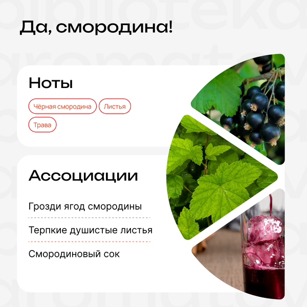 Аромат, который переносит вас на русскую дачу в разгар лета. Перед вами предстают гроздья спелой чёрной смородины, душистые, чуть терпкие листья и трава, прогретая солнцем. Это гимн простым и самым сладким удовольствиям — вкусу и запаху лета.