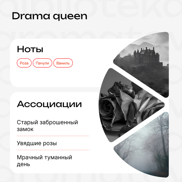 Грустный и глубокий аромат с нотами заброшенного замка, мокрой земли, тумана и увядшей розы — так мы видим образ Drama Queen. Если страдать, то красиво.
