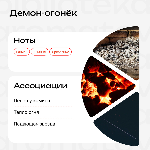Знакомьтесь, это могущественный демон Кальцифер. Когда-то он был прекрасной падающей звездой. Но, как и колдун Хаул, мы поймали Кальцифера прямо во флакон и заключили с ним контракт. Ведь на самом деле это милое и энергичное существо, которое особенно любит внимание и комплименты. А что может быть эффектнее, чем раскрываться на коже тёплым сладким пламенем и оставлять за собой лёгкий пепельный шлейф? Так привлекать внимание не пробовал ещё ни один аромат, но у «Демона-огонька» точно получится.