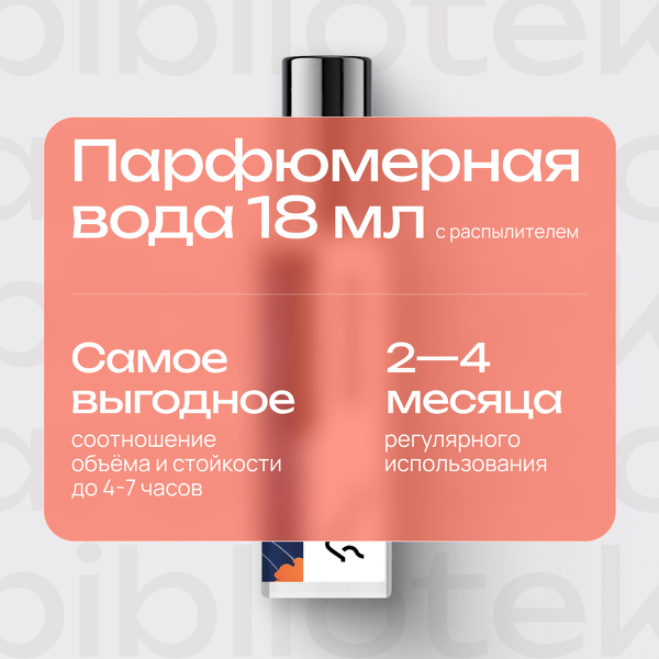Парфюмерная композиция 18%Уникальное сочетание высококачественных натуральных или синтетических парфюмерных компонентов. Концентрация в парфюмерной воде составляет 18%, что обеспечивает стойкость аромата на коже от 4 до 7 часов.