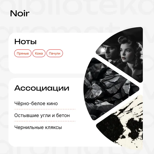 Чёрный вам к лицу. В аромате переплетаются эстетика викторианской готики, криминальных драм 40-х и Средневековья. Ноты чёрного угля, бетона и чернил — это нуар сквозь века.