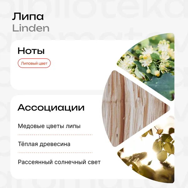 Чёткий моноаромат липового цвета без посторонних оттенков. Звучание ровное, натуральное, с узнаваемой медово-травяной нотой и лёгкой сухостью в базе. Подойдёт для повседневного ношения и тем, кто не любит сложные композиции.