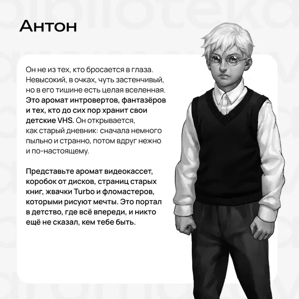 Он не из тех, кто бросается в глаза. Невысокий, в очках, чуть застенчивый, но в его тишине есть целая вселенная. Это аромат интровертов, фантазёров и тех, кто до сих пор хранит свои детские VHS. Он открывается, как старый дневник: сначала немного пыльно и странно, потом вдруг нежно и по-настоящему.