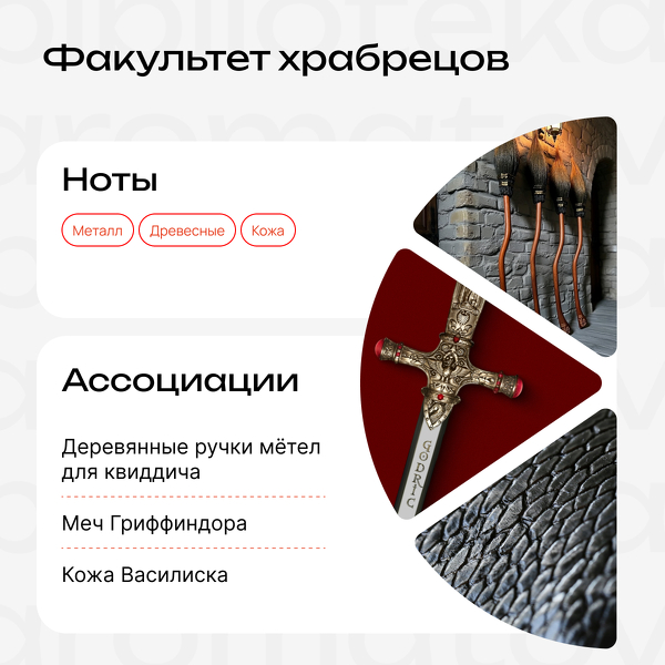 Добро пожаловать на факультет смелых, решительных и отважных магов. Здесь нет идеальных героев. Но есть те, кто следует храбрым порывам в момент выбора. Для гриффиндорцев смелость — это не отсутствие страха, а умение действовать вопреки ему. Поэтому и в аромате факультета вы услышите дерево самых скорых мётел, металл серебряного меча Гриффиндора и кожу Василиска, побеждённого главным героем.