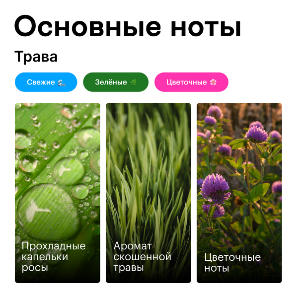 Это та самая свежая трава, которая растёт в лесу или на газоне возле вашего загородного дома. На ней играют, на ней лежат, а спортсмены на ней занимаются спортом. В одном флаконе мы попытались уместить не только запах свежескошенной травы, но и все ваши воспоминания, связанные с летом.