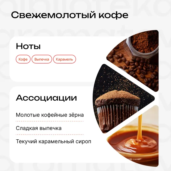Молотые кофейные зёрна, сладкая выпечка, текучий карамельный сироп
