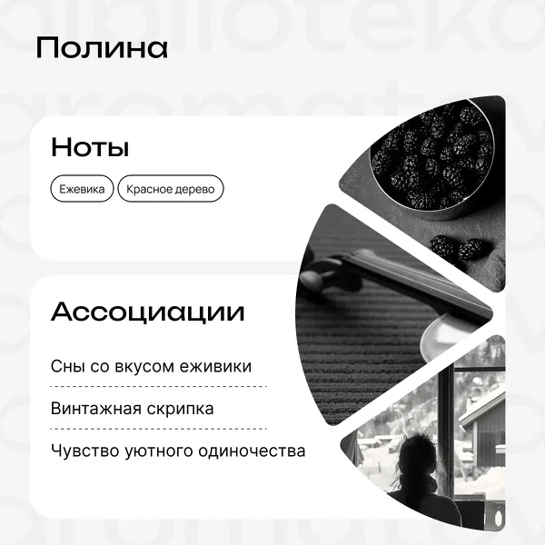 Аромат звучит, как тихая скрипичная нота, застывшая в темноте комнаты. Ежевика здесь мягкая, словно воспоминание, которое не отпускает. «Полина» создаёт образ тихого, тёплого одиночества, в котором почему-то спокойно.
