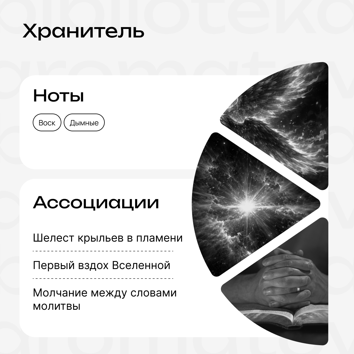 Внутри флакона древняя сила, плетущая материю и наблюдающая за своим творением сквозь бесчисленные глаза. Это неоднозначное пламя, которое дарит свет и испепеляет. Это и тишина перед ответом на молитву, и сам обжигающий душу ответ. Поэтому в аромате Хранителя сухой жар чистого пламени и умиротворяющий, тающий воск церковной свечи. Это не просто запах, а состояние — пограничное ощущение между бытием и небытием. Когда ты слышишь дыхание самого мироздания, но ещё не знаешь, какой финал оно тебе уготовило.