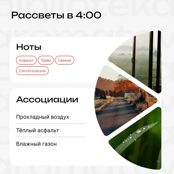 Прозрачный и неуловимый, как и летний рассвет. Цветочные и свежие ноты под городской пылью в солнечных лучах. Очень романтичная композиция, чувствуется уставшая нега.