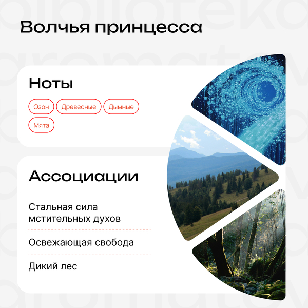 Она — лесная сила, красивая, опасная, необузданная. Её мир — мир равновесия, в котором всё имеет право быть, но где нет места жадности и разрушению. Она рождена не природой, а принята ею. Воспитана волчицей, и потому её человечность чуждая, но сильная и непоколебимая. В её волосах всегда холодный свежий ветер, а кожа пахнет диким лесом, мятными травами и дымкой. Хотите почувствовать её силу, за которой готовы следовать даже всемогущие духи природы? Просто нанесите аромат.
