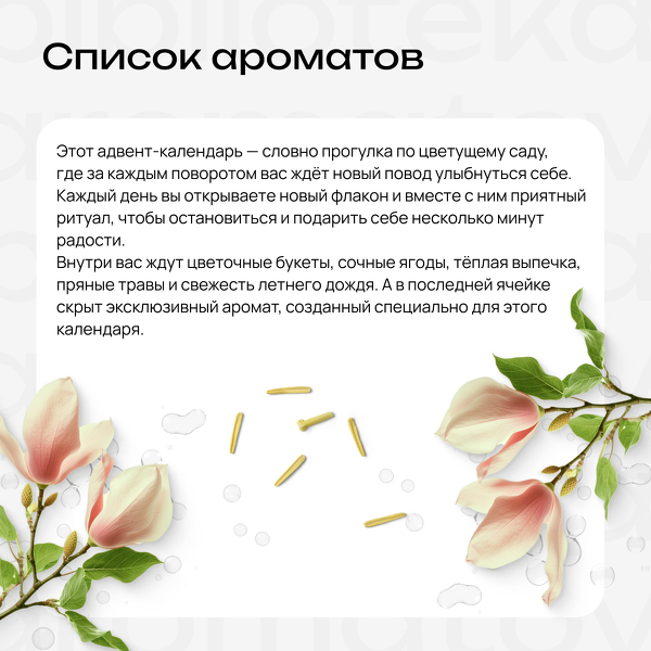 Этот календарь — словно прогулка по цветущему саду, где за каждым поворотом вас ждёт новый аромат и новый повод улыбнуться себе. Каждый день вы открываете новый флакон и вместе с ним приятный ритуал, чтобы остановиться и подарить себе несколько минут радости.