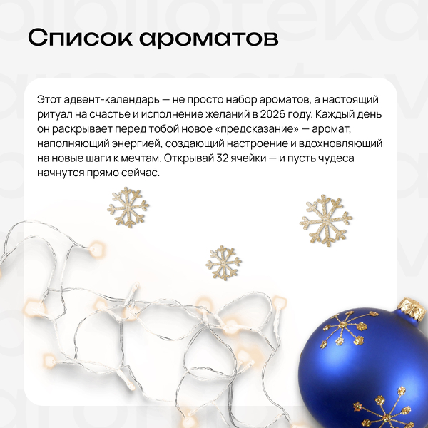 Этот адвент-календарь — не просто набор ароматов, а настоящий ритуал на счастье и исполнение желаний в 2026 году. Каждый день он раскрывает перед тобой новое «предсказание» — аромат, наполняющий энергией, создающий настроение и вдохновляющий на новые шаги к мечтам.