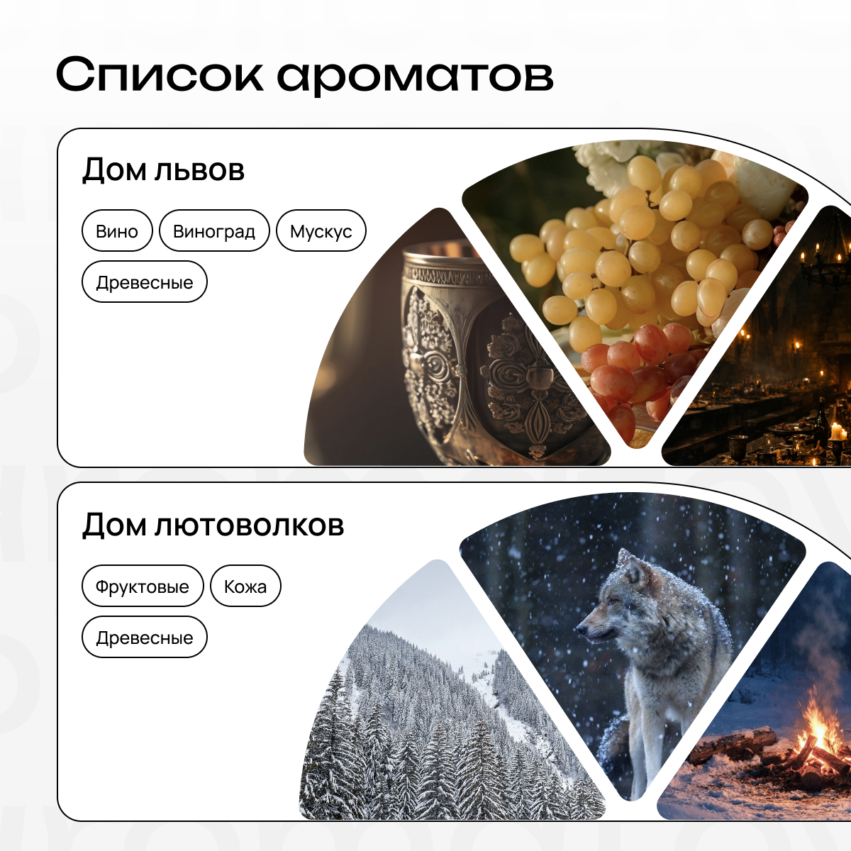 Дом Львов — золотые кубки, зрелый виноград, мускус и тёплое дерево. Власть, растворённая в роскоши.
