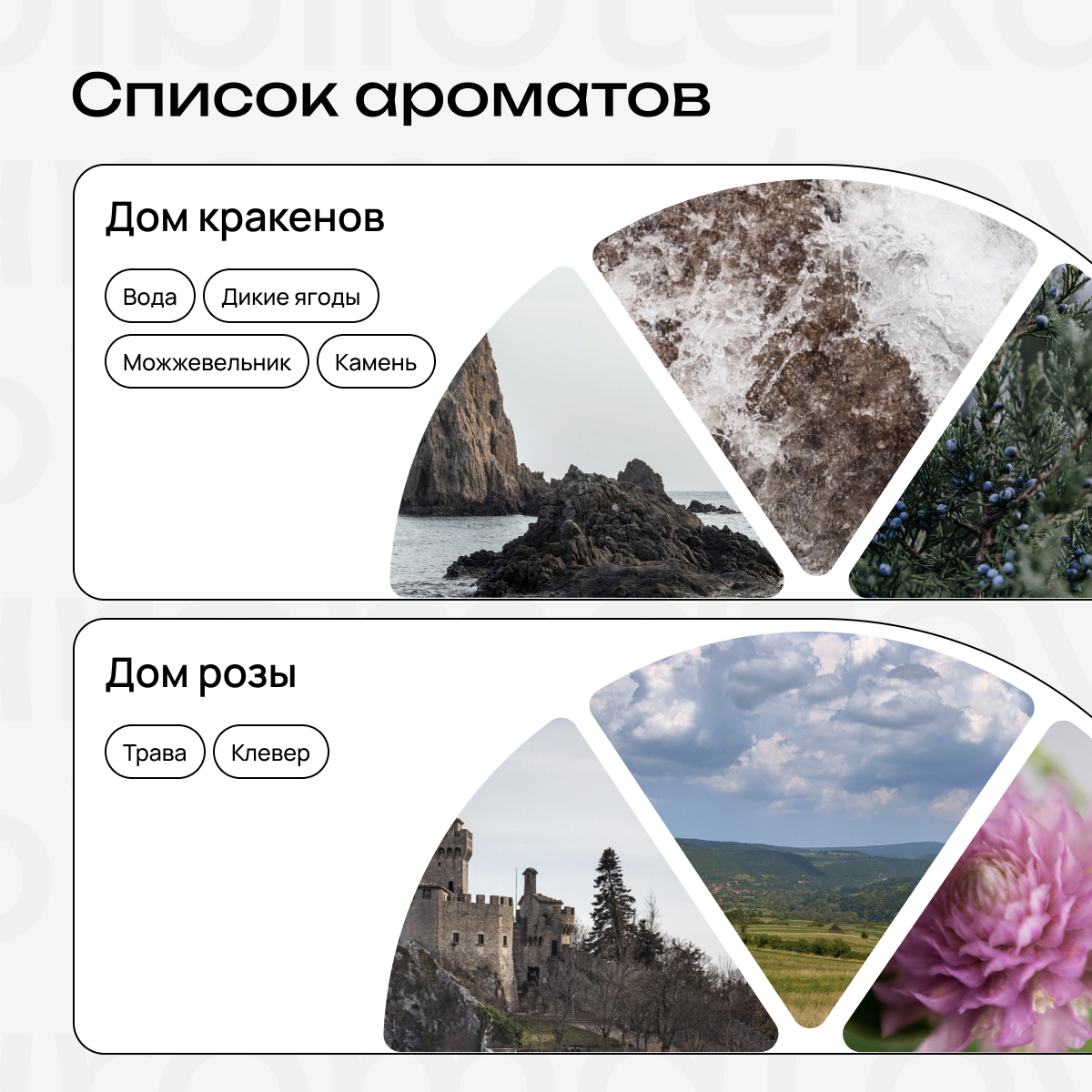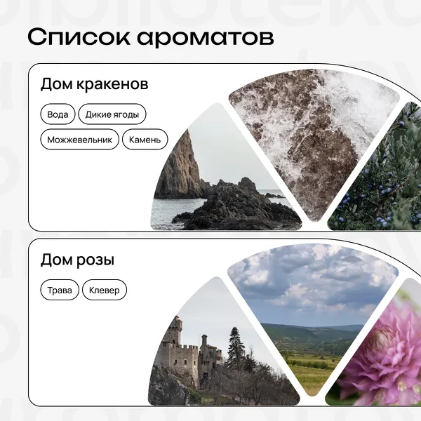 Здесь вы найдете схожие по нотам ароматы, а также интересные варианты для смешивания. Если смешать ноты из разных категорий, получится удивительная композиция. Экспериментируйте и наслаждайтесь творчеством!