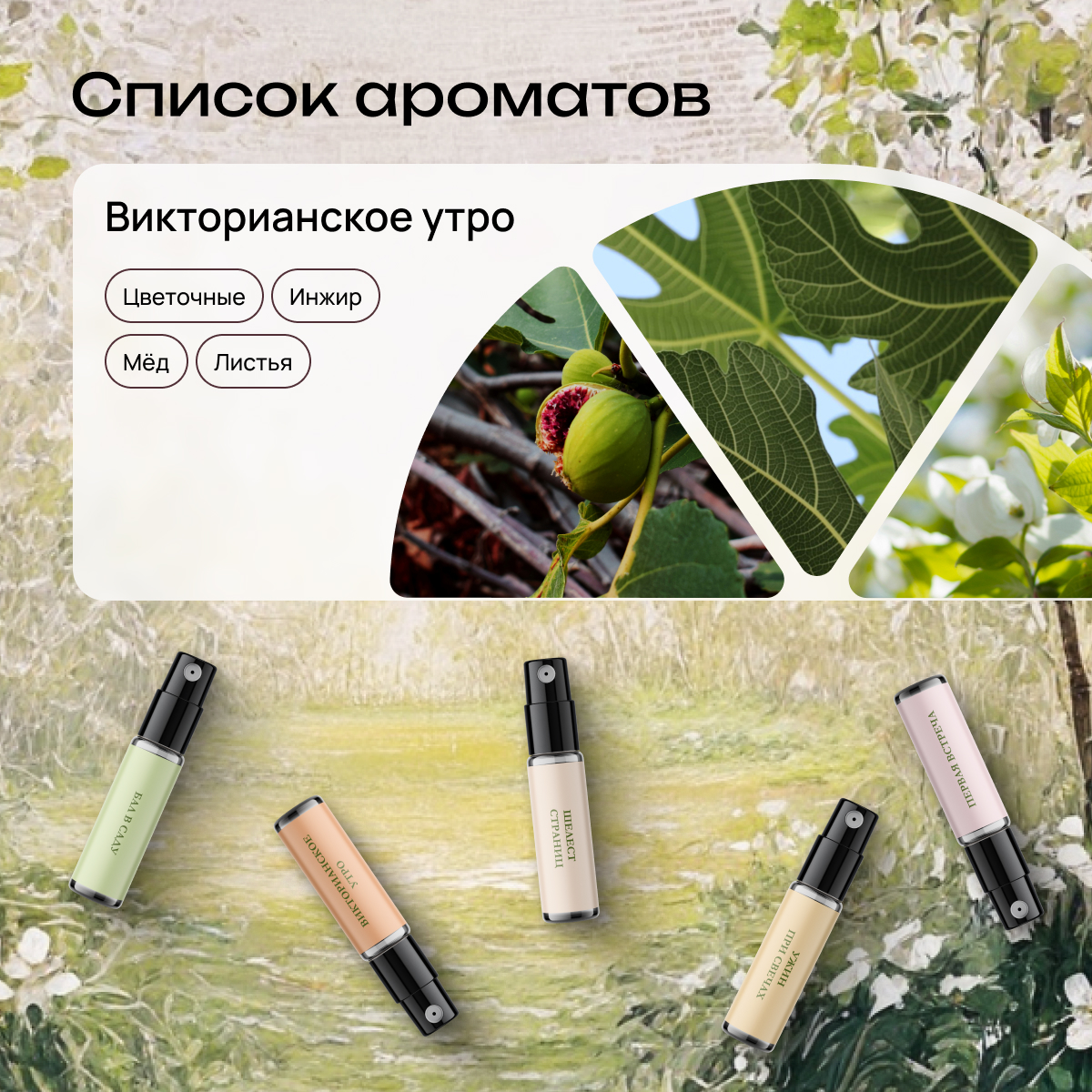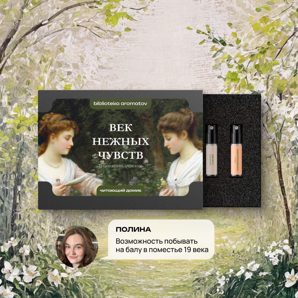 Полина: «Наполнение бокса — отражение одного из самых близких мне литературных периодов, романы о которых я читаю множество лет. Эта композиция — то, как я представляю обычный день, если бы у меня была возможность переместиться в то время! Гармония, свежесть, тепло и окутывающее ощущение спокойствие — надеюсь, вы сможете почувствовать это в ароматах!».