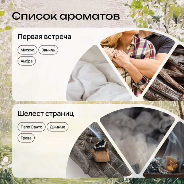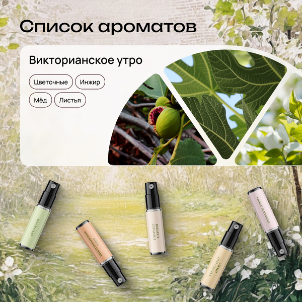 В боксе 5 ароматов-сюжетов: «Бал в саду» с нежным дыханием розы и пиона, «Ужин при свечах» с тёплым янтарём и медовой сладостью, «Первая встреча» с чувственным мускусом, ванилью и амброй, «Шелест страниц» с дымным пало санто и «Викторианское утро» с сочным инжиром, мёдом и цветочными нотками. Немного литературной магии и много тепла в каждом флаконе.