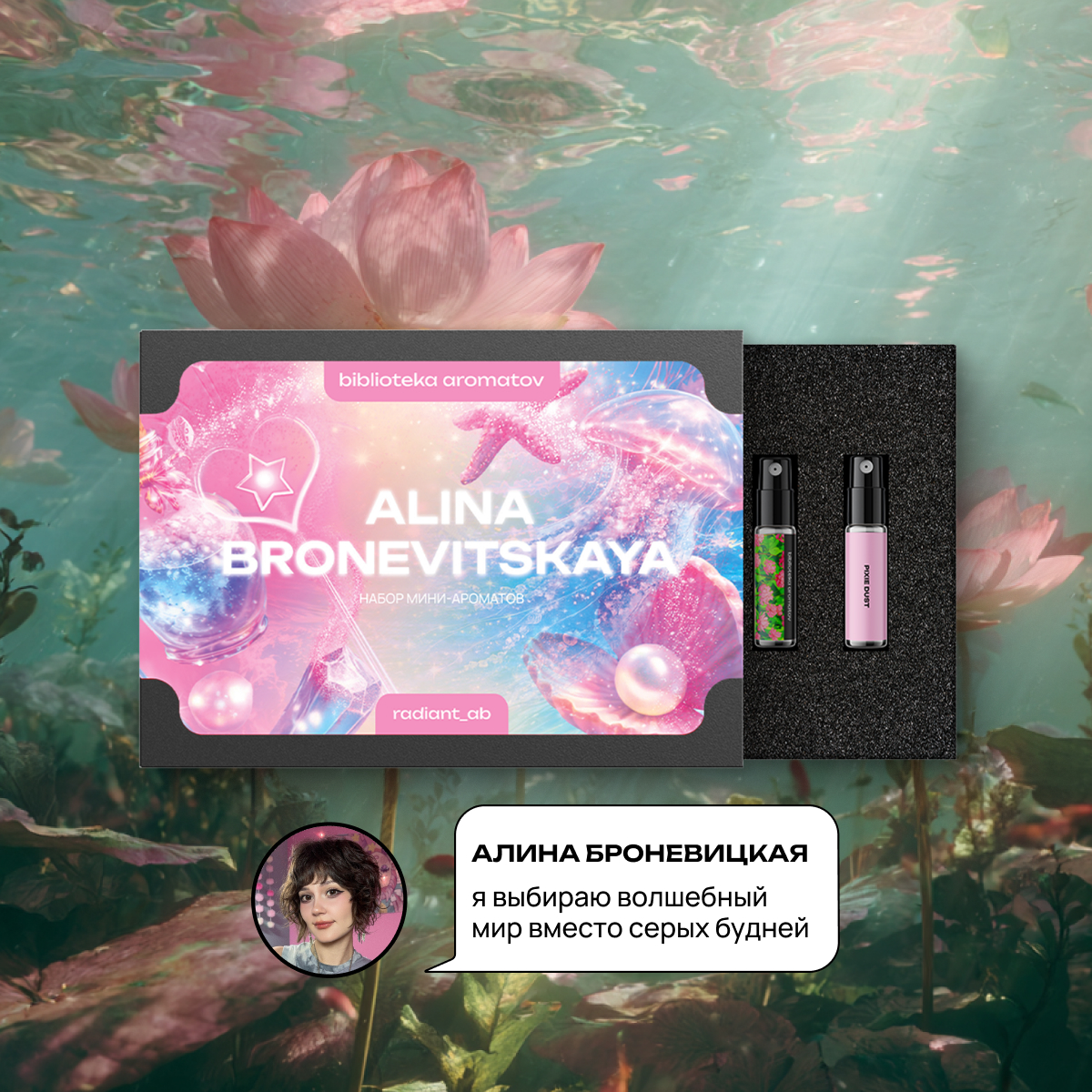Алина Броневицкая: «А что если серые будни можно заменить волшебством? Мне всегда нравилось играть с образами, придумывать маленькие истории через одежду и макияж. В какой-то момент я поняла, что хочу перенести эту игру в ароматы. Чтобы каждый день можно было выбирать не просто запах, а настроение и роль. Каждый аромат в этом боксе — портал в мой красочный мир. Мир, где можно быть яркой, трогательной, смелой и настоящей одновременно».
