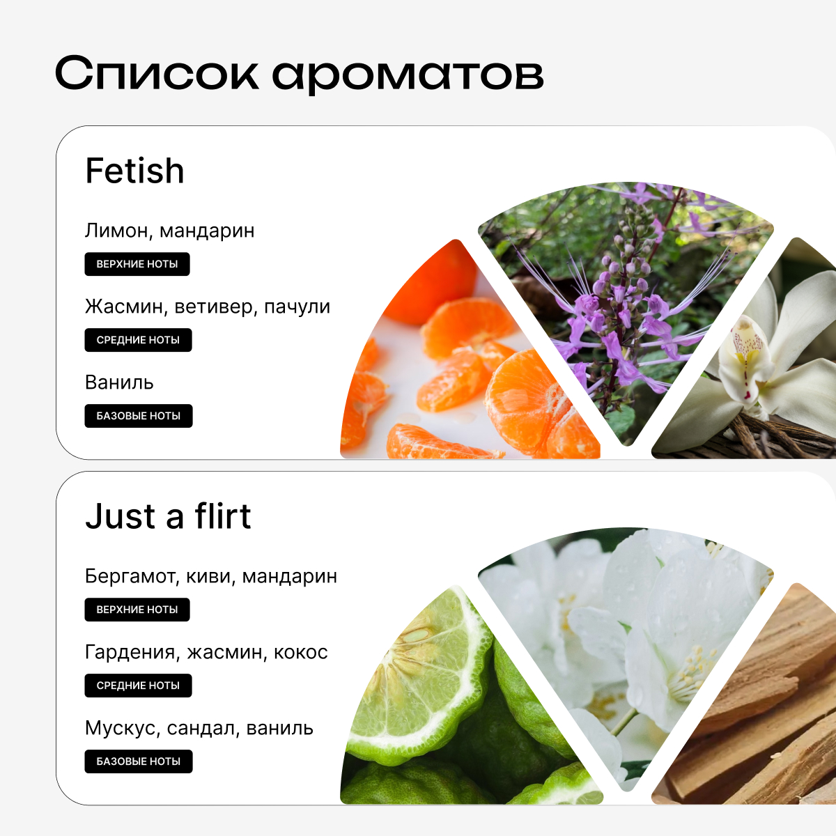 Fetish — цитрусовый щелчок, погружающийся в тёмное сердце из жасмина, ветивера и пачули. Финал крепко держит обволакивающей сладостью ванили. Фетиш, ставший навязчивой идеей.