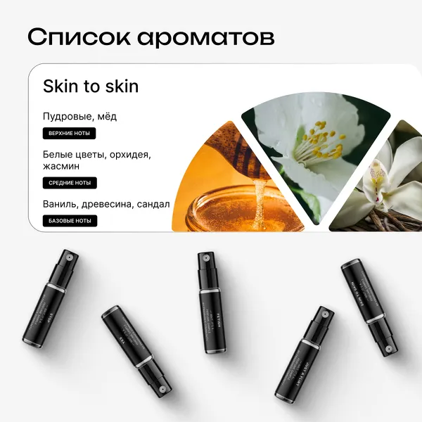 Skin to Skin — медово-пудровая нежность, роскошный букет белых цветов и тёплое основание из ванили, древесины и сандала. Интимность в чистом виде.