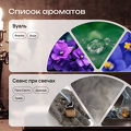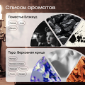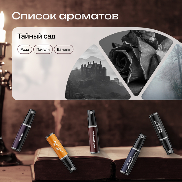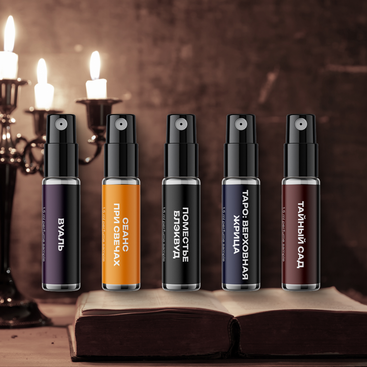 В боксе 5 ароматов-историй: «Вуаль» с нежной пудрой фиалки, «Сеанс при свечах» с дымным пало санто, «Поместье Блэквуд» с пряными акцентами и кожей, «Таро: Верховная жрица» с молочным спокойствием лаванды и мускуса, и «Тайный сад» с терпкой розой, пачули и сладкой ванилью.