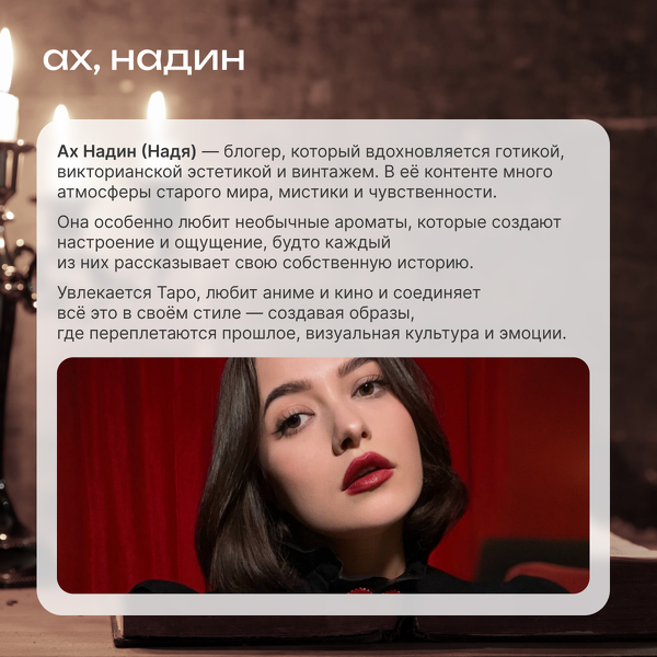 Надин: «Концепция бокса родилась из моей любви к викторианской эпохе — времени, в котором особое значение придавалось деталям и эстетике. Меня всегда привлекала эта сдержанная роскошь, утончённость и ощущение скрытой глубины за внешней строгостью.