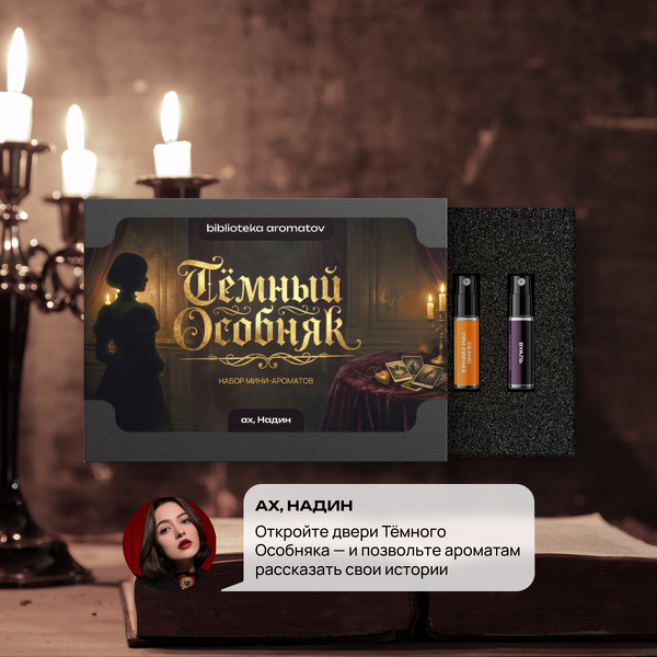 Название «Тёмный Особняк» родилось как собирательный образ всех этих ощущений. Это не просто место, а пространство, наполненное историями, воспоминаниями и скрытыми смыслами. Каждый аромат в боксе — словно отдельная сцена или момент, который можно почувствовать, как будто вы находитесь внутри этого особняка: среди свечей, шёпота, предсказаний и теней прошлого».