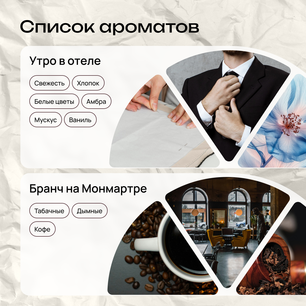 Я собрала ароматы, которые ассоциируются у меня с этим состоянием: утро в отеле, кофе на узких улицах, тёплый воздух после дождя, старые книги и тихие вечера.