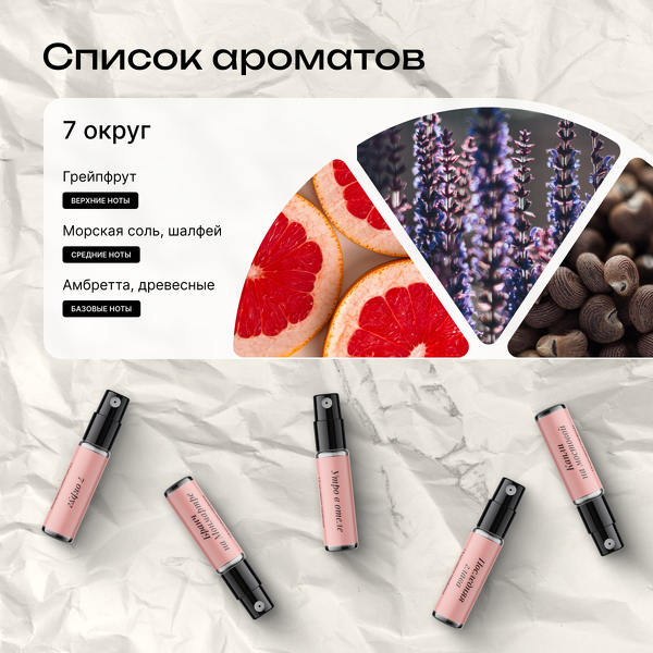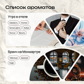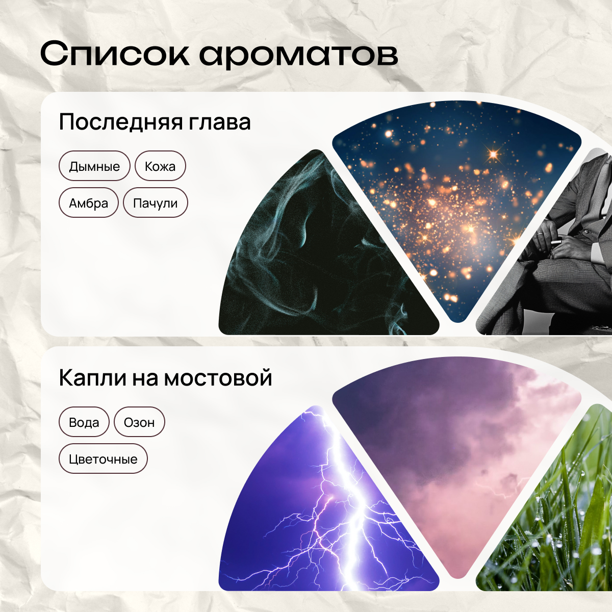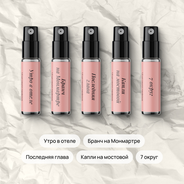 В боксе 5 ароматов-воспоминаний: «Утро в отеле» с чистотой хлопка, белых цветов и мускусом, «Бранч на Монмартре» с дымным табаком и терпким кофе, «7 округ» с искристой морской солью, грейпфрутом и древесиной, «Капли на мостовой» с прозрачной водой и озоном, и «Последняя глава» с тёплыми дымными нотами, кожей и амброй. Немного французского шарма и много тихой романтики в каждом флаконе.