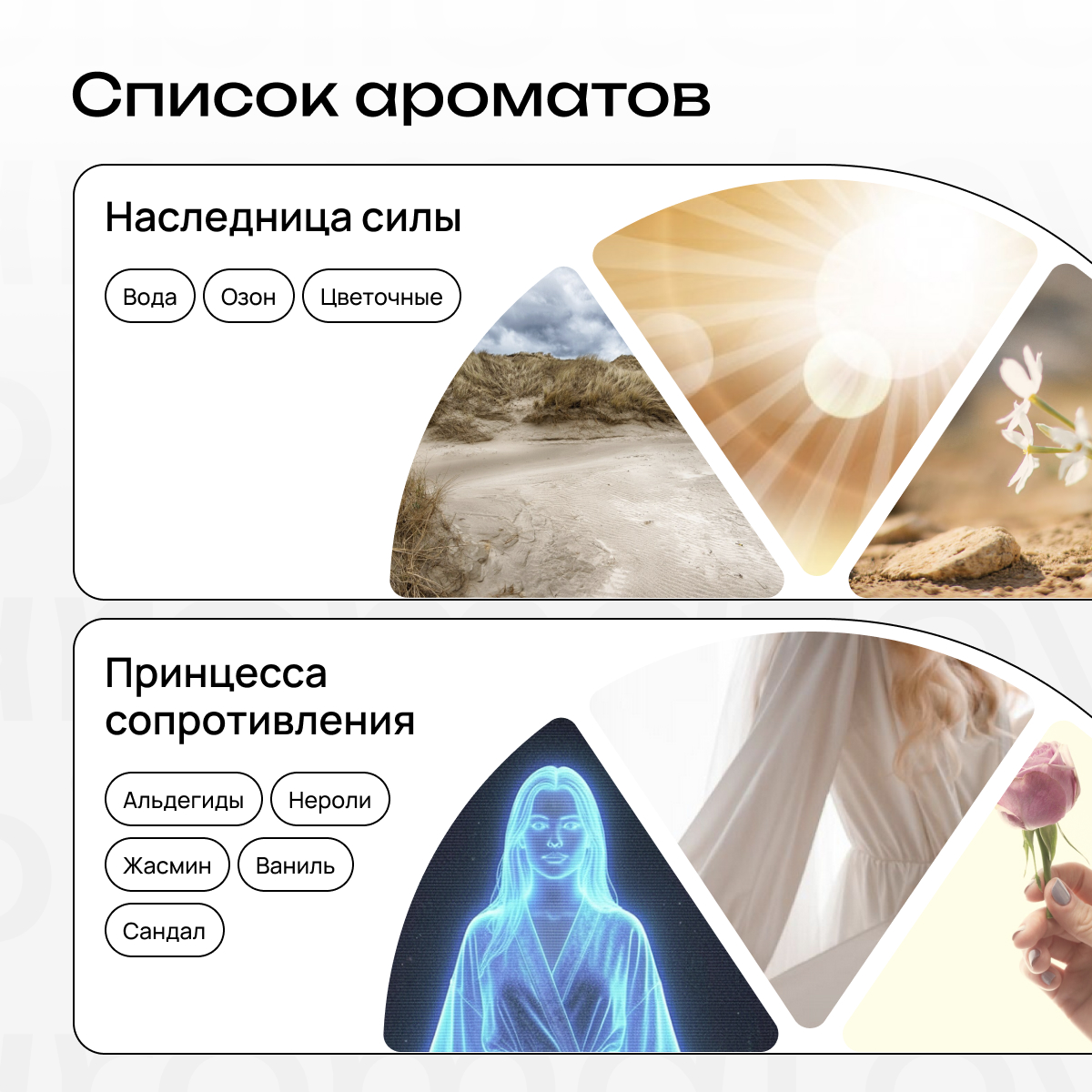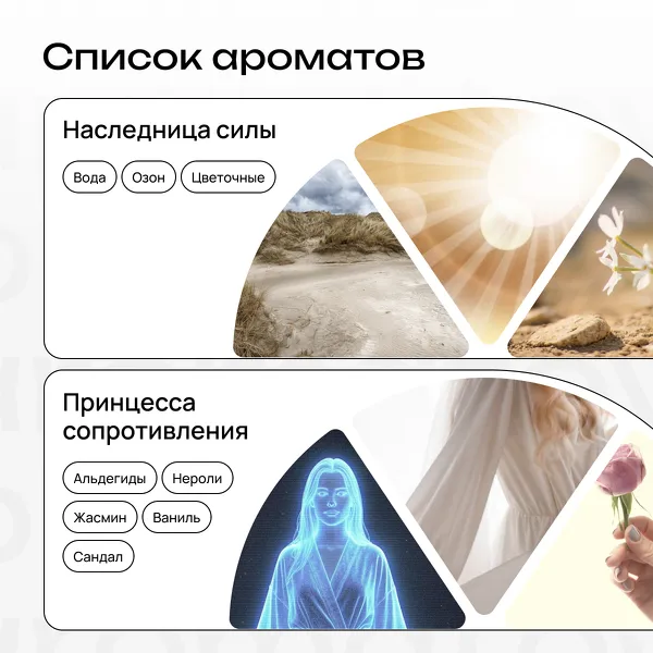 Принцесса сопротивления — сверкающие альдегиды и благородный жасмин с нероли, за которыми скрывается тёплая броня из сандала и ванили. Стойкость генерала, согревающая повстанцев в самый холодный час.