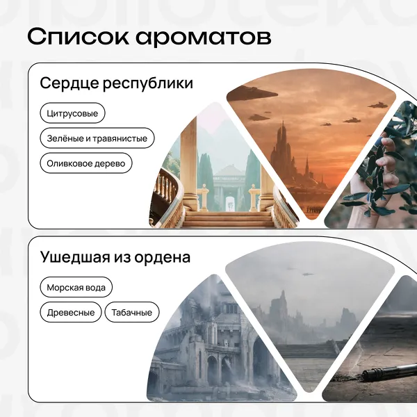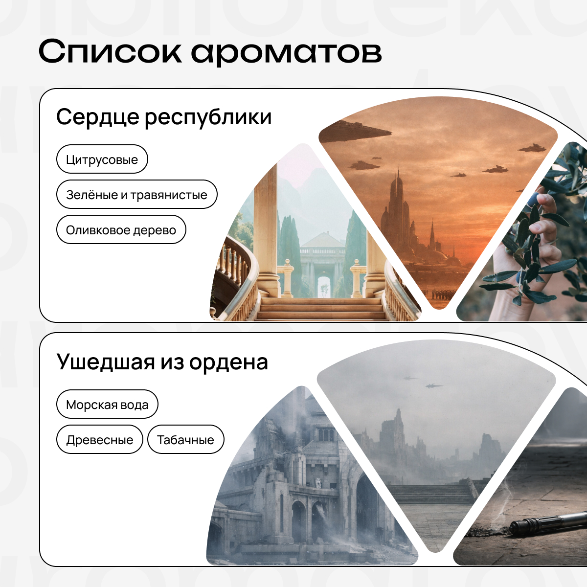 Ушедшая из ордена — свежая морская вода, дымный табак и смолистая древесина. Аромат свободы, добытой в бою без наставников, но с двумя световыми мечами наготове.