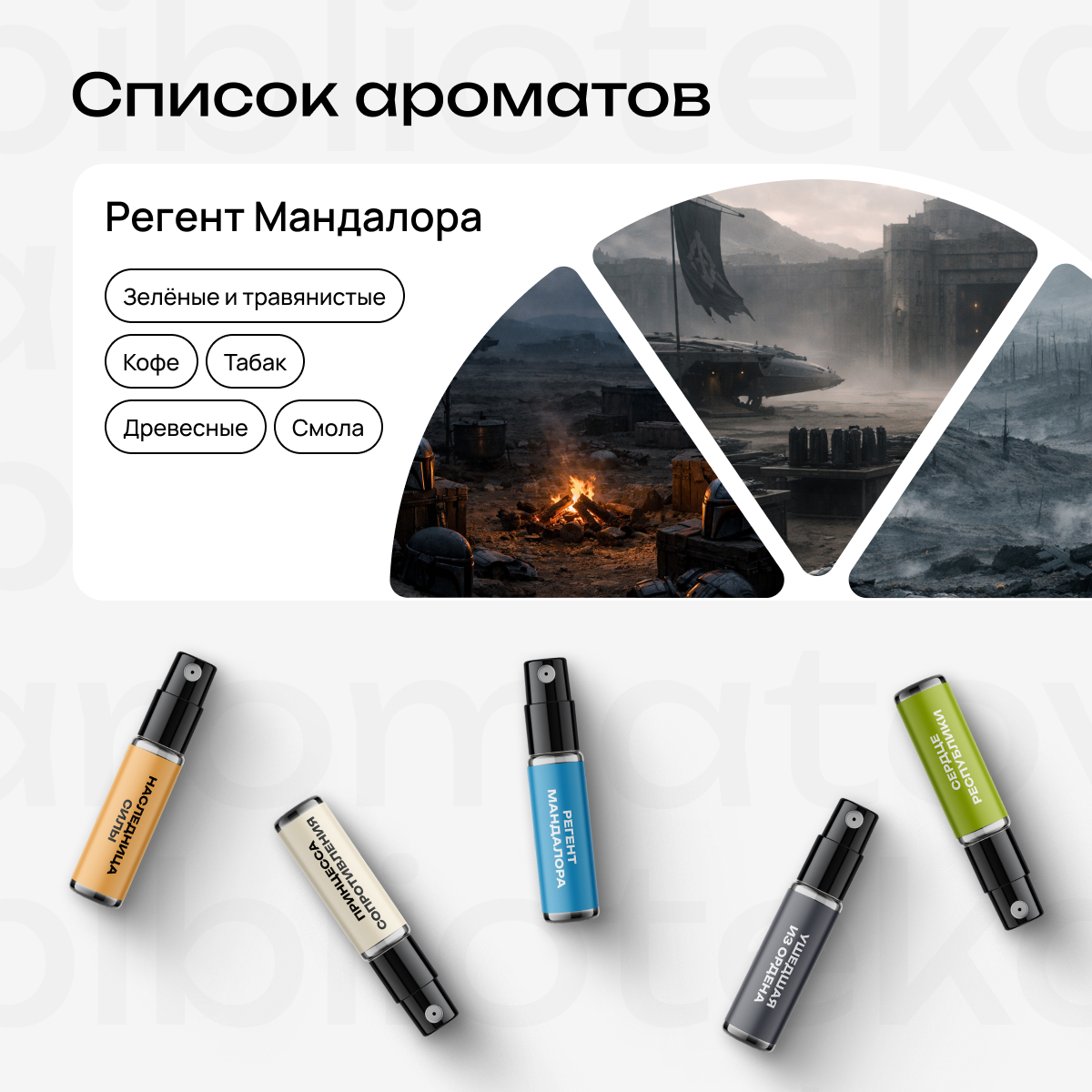 Регент Мандалора — терпкая зелень, дроблёный кофе, сухой табак и властная смола. Аромат той, кто не просит трон, она его завоёвывает.