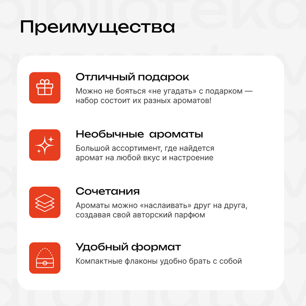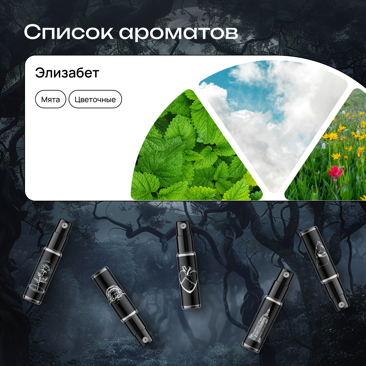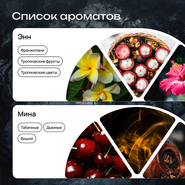 В боксе 5 ароматов-образов: «Мина» с терпким аккордом табака и вишни, «Белль», напоминающая пряное яблоко, «Энн» с нотами тропических цветов, «Элизабет» — мятное облако и загадочная «Кристина», переносящая в атмосферу чайной церемонии.